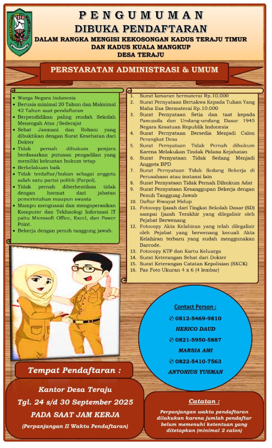 TERAJU - Pemerintah Desa Teraju Membuka Pendaftaran Calon Perangkat Desa Jabatan Kepala Dusun Teraju Timur dan Muara Mangkup. Pemerintah Desa Teraju, Kecamatan Toba, Kabupaten Sanggau, secara resmi mengumumkan pembukaan pendaftaran calon Kepala Dusun Teraju Timur dan Muara Mangkup. MASA PERPANJANGAN KEDUA mulai tanggal 24 - 30 September 2025. Kesempatan ini terbuka bagi seluruh warga Dusun Teraju Timur dan Muara Mangkup serta masyarakat Teraju secara umum, yang memenuhi persyaratan dan berminat untuk mengabdi kepada masyarakat. Tahapan seleksi calon Kepala Dusun Teraju Timur dan Muara Mangkup akan berlangsung secara transparan dan profesional. Setelah periode pendaftaran ditutup, panitia seleksi akan melakukan pemeriksaan berkas administrasi, Pengumuman hasil seleksi administrasi akan diumumkan. Bagi calon yang dinyatakan lolos seleksi administrasi, selanjutnya akan mengikuti tahapan uji kompetensi dan wawancara. Uji kompetensi ini bertujuan untuk mengukur kemampuan dan potensi calon dalam menjalankan tugas dan tanggung jawab sebagai Kepala Dusun. Pengumuman akhir hasil seleksi calon Kepala Dusun akan diumumkan ketika peserta yang mendaftar minimal 2 (dua) orang. Pemerintah Desa Teraju berharap proses seleksi ini dapat menghasilkan Perangkat yang kompeten, berintegritas, dan mampu membawa kemajuan bagi Dusun umumnya Desa Teraju ini. Informasi lebih lanjut mengenai persyaratan pendaftaran dan berkas yang dibutuhkan dapat diperoleh di Kantor Desa Teraju (sesuai foto di atas).